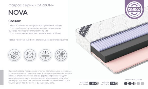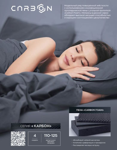Матрас средней жесткости с самыми высокими эксплуатационными характеристиками на основе пружинного блока «Bonnel» с металлической рамкой усиления по периметру. Пена с угольной пропиткой «Carbon Foam» обладает высокой плотностью, хорошо держит весовую нагрузку и абсорбирует неприятные запахи. В сочетании с комфортным трикотажем, стеганным на гипоаллергенном волокне, данный матрас является доступным и надежным аналогом более дорогих моделей.