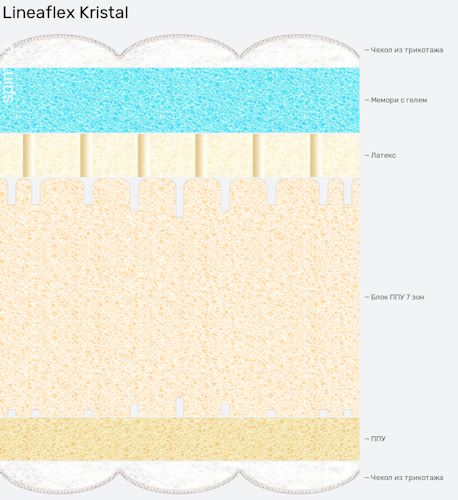Высота матраса Кристалл составляет 30 см. Максимальный вес человека не ограничен. Комплектуется красивым несъемным чехлом с терморегулирующими особенностями. Жесткость данной модели относится к классу «средняя».