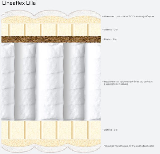 Одна сторона латекс толстый, другая – латекс тонкий с кокосом. Сердце Лилии – блок независимых пружин, обеспечивающий ортопедическую поддержку. Каждая деталь идеально взаимодействует друг с другом и создана для того, чтобы обеспечивать умиротворяющую атмосферу в Вашей спальне.