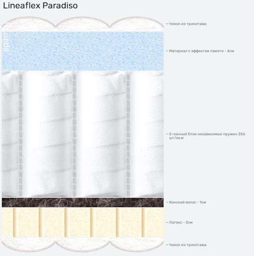 Матрас Paradiso – настоящий рай в Вашей спальне! Большая, комфортная, удобная модель с отменными ортопедическими свойствами. Пока Вы спите, он поддерживает анатомический характер Вашего тела, запоминает все движения и расширяет возможности легкого и здорового отдыха.