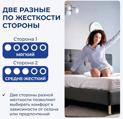 Основой является пятизональный независимый пружинный блок с разными натуральными наполнителями. Один из них – автомоделируемая орто-пена, способная добавить мягкой нежности в Ваш сон, а другой – латекс с конским волосом, гарантирующий полноценную жесткость Вашей кровати. Таким образом, Вы сами можете контролировать уровень комфорта, переворачивая матрас на ту или иную сторону.