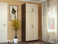 Модель разделена на две зоны, каждая из которых оснащена распашными дверцами, в большей части находятся полки и отделение с хромированной штангой, часть поменьше представляет собой вместительную нишу для хранения, изделие выполнено из ЛДСП.